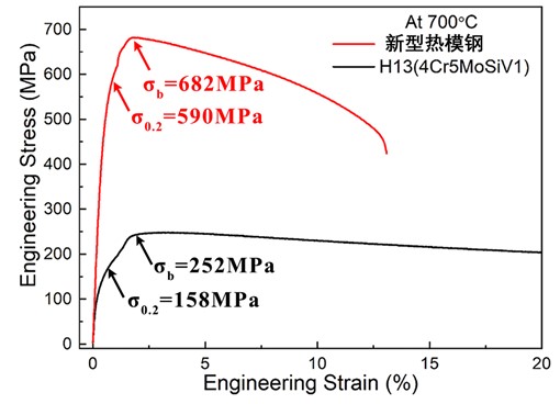 (1)高温高强度:新材料700℃高温强度达550~650MPa,现用H13、DIEVAR等先进热模钢2倍以上,使用温度提高至650-750℃,较现用热模钢提升100℃以上;